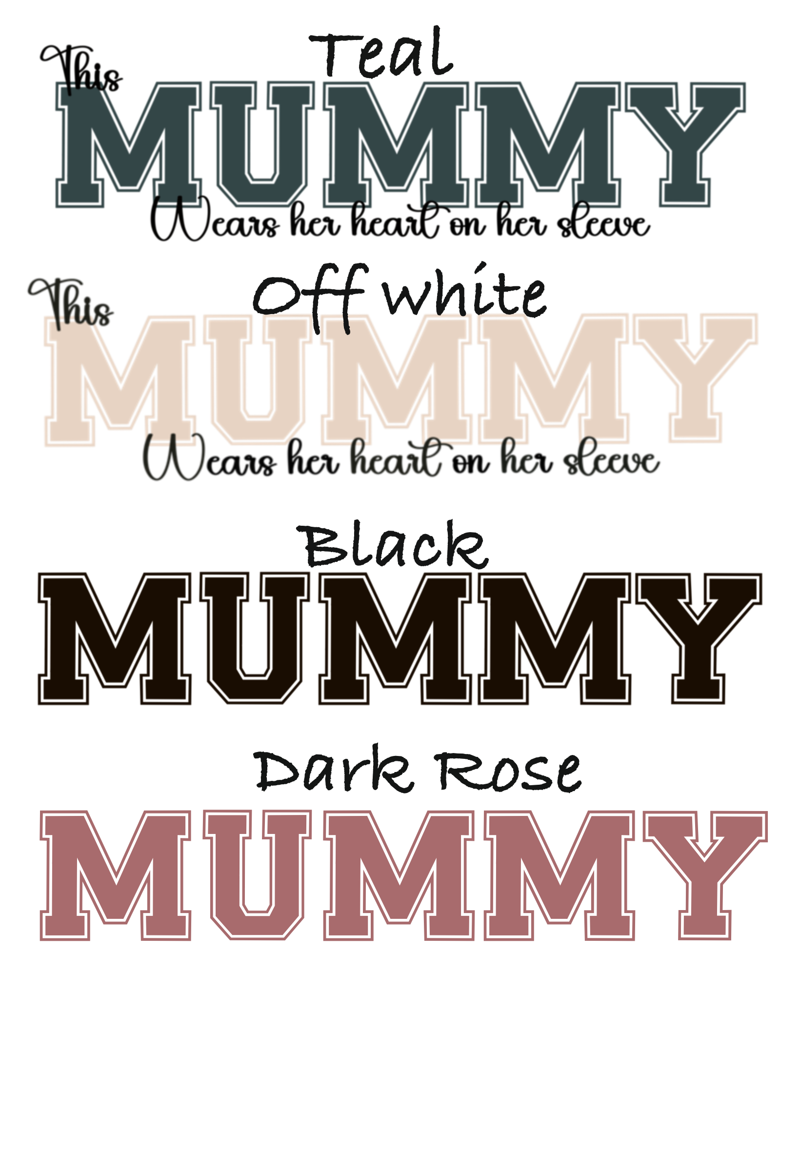 Personalised- Choose name for the Varsity style font for on the chest area ie Mum, Mummy, Grandma, aunt etc. Along with names on the sleeve in a plain script font with the option of addition hearts or wings. Colour options for the chest font include Off white, Black, Teal & Dark rose